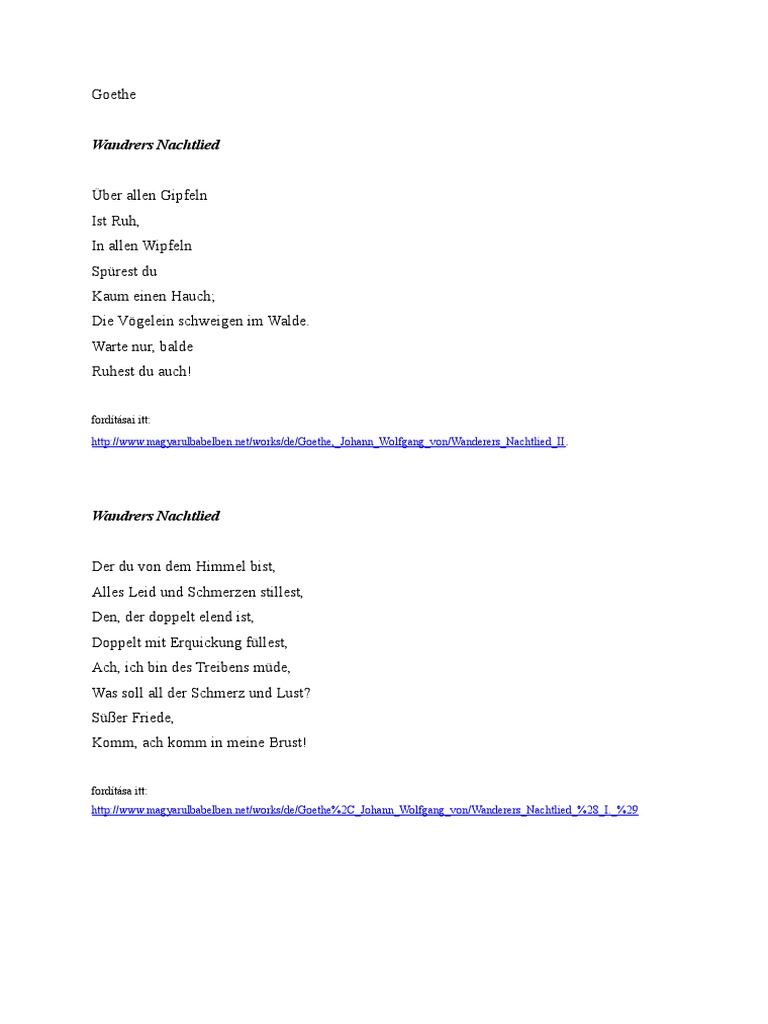 Also known as wandrers nachtlied ii; .русских поэтов johann wolfgang goethe wanderers nachtlied ueber allen gipfeln ist ruh, in русских поэтов johann wolfgang goethe wanderers nachtlied ueber allen gipfeln ist ruh, in allen. Помогите перевести wanderers nachtlied. немецкий → неаполитанский doctorjojo. Warte nur, balde ruhest du auch. Eines abends schrieb er es mit einem bleistift an eine einfache hüttenwand im.